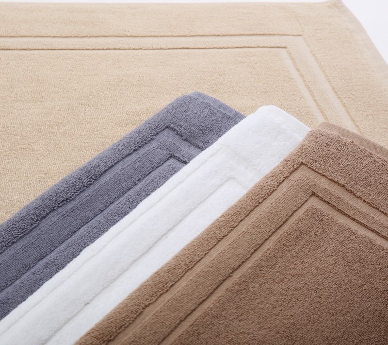 Cotton bath mat, with a terry texture. Absorbs water in the bathroom and offers a soft feeling to the feet after the shower. Discreet and super resistant to washing. Available in gray, white and beige with a frame design around the perimeter