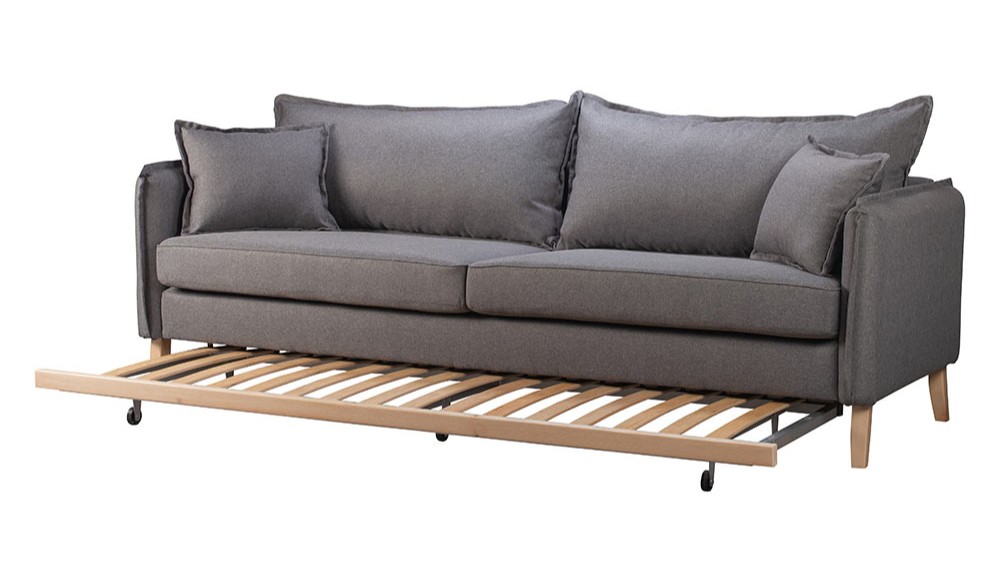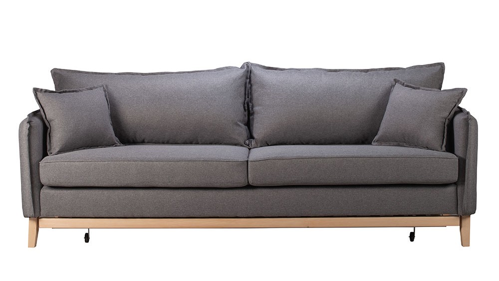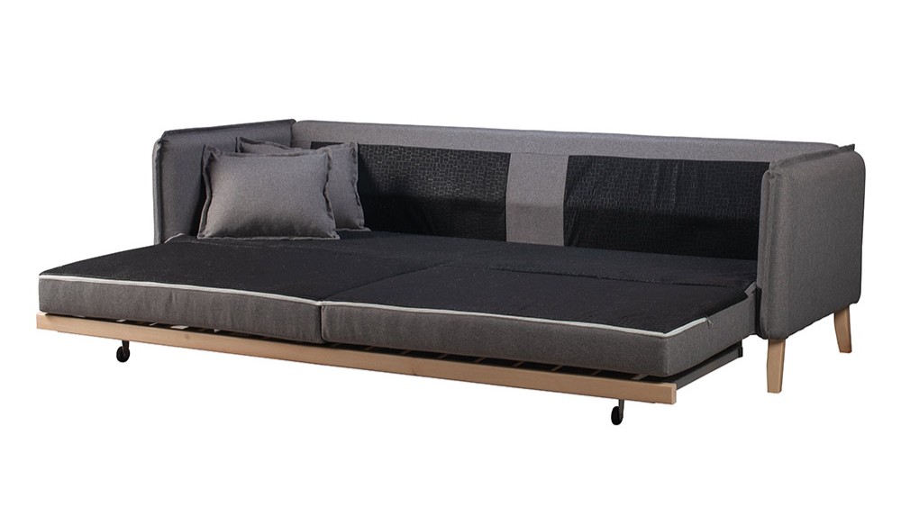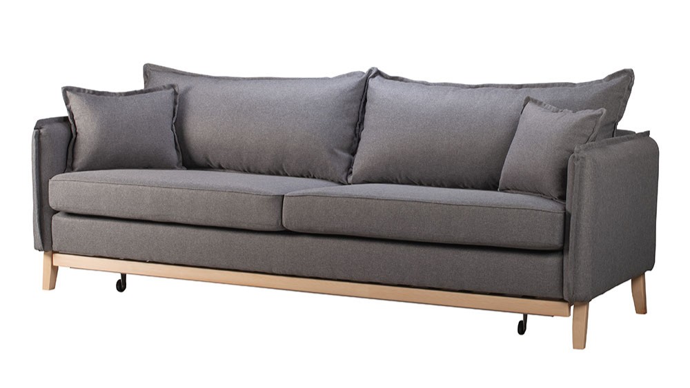 Darwin is a 3-seater sofa that transforms into a bed with its anatomical slats offering a peaceful sleep. It features elegant armrests with scalloped edges, two large back cushions and two decorative pillows.